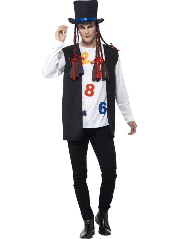 80s Pop Star Costume including Top, Waistcoat and Hat with Braids.
